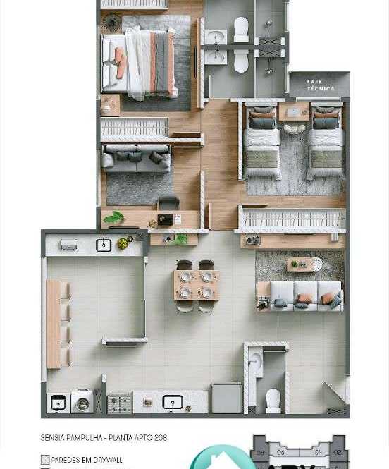 3 dormitórios sendo 1 suíte, 1 sala, 2 banheiros, 1 vaga